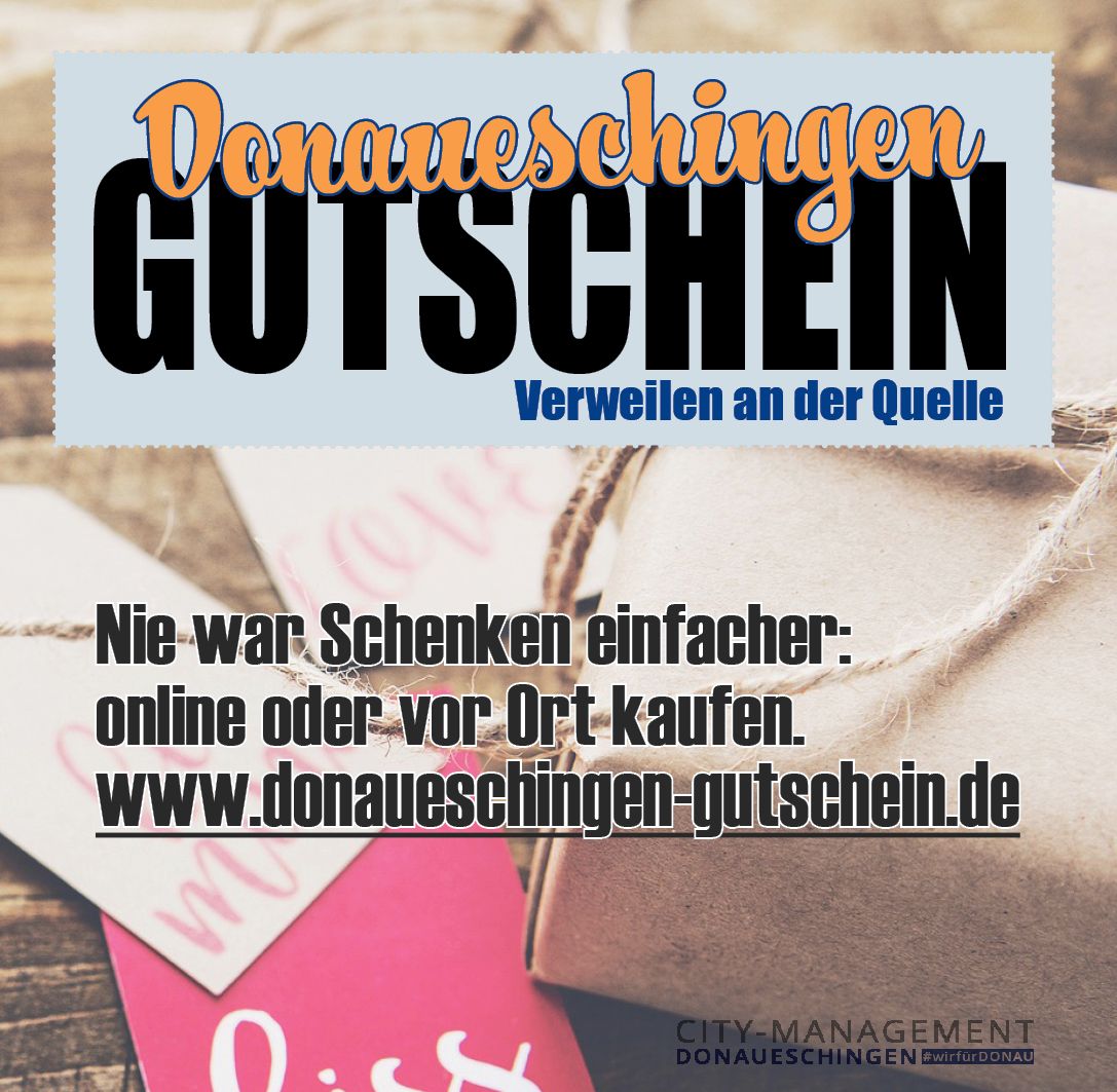 Die ideale Geschenk-Idee, auch Last-minute zum selbst Ausdrucken. In Donaueschingen in über 35 Geschäften einlösbar. Ob Mode, Feinkost, Reisebüro, Gastronomie, Drogerieprodukte uvm. Mehr Auswahl und mehr Einkaufsspaß.
